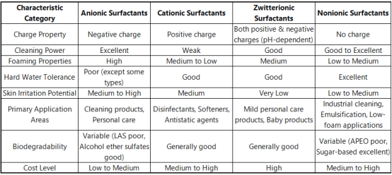 Selecting the best surfactant needs factor to consider of several variables, including application needs, cost, environmental problems, and regulatory needs. The following table summarizes the key attributes of the 4 primary surfactant groups: